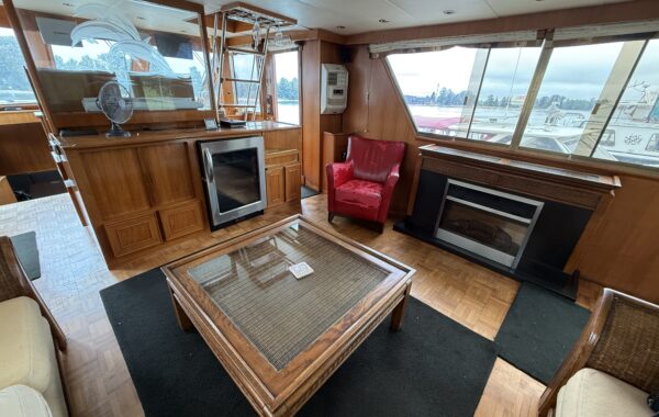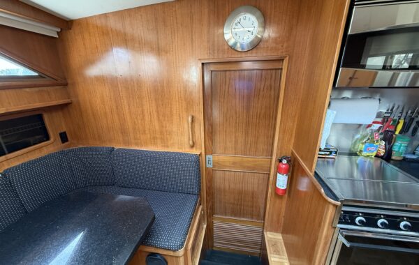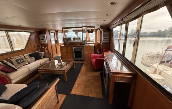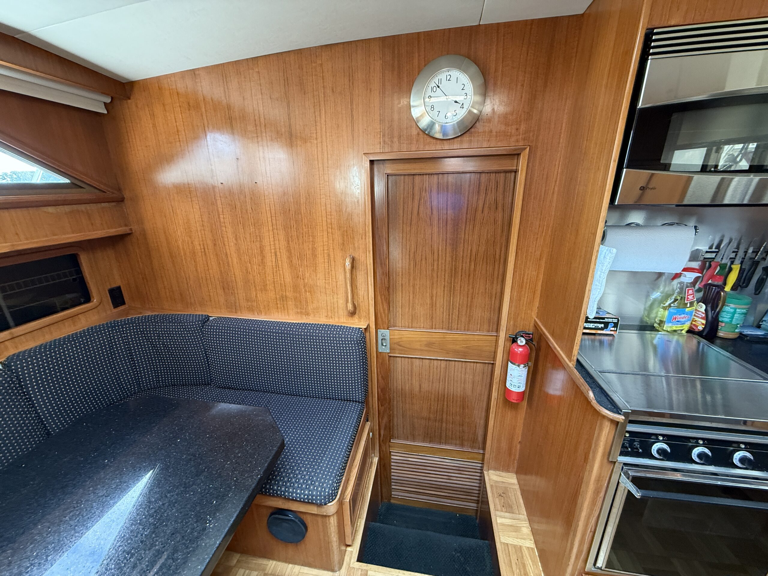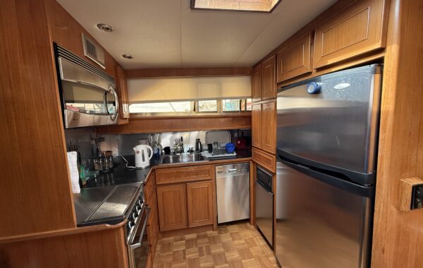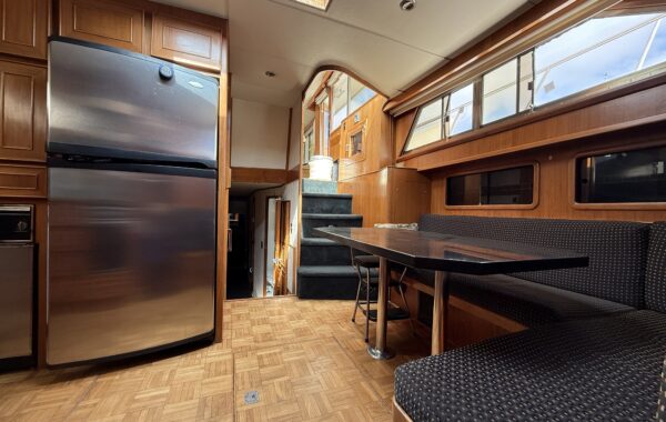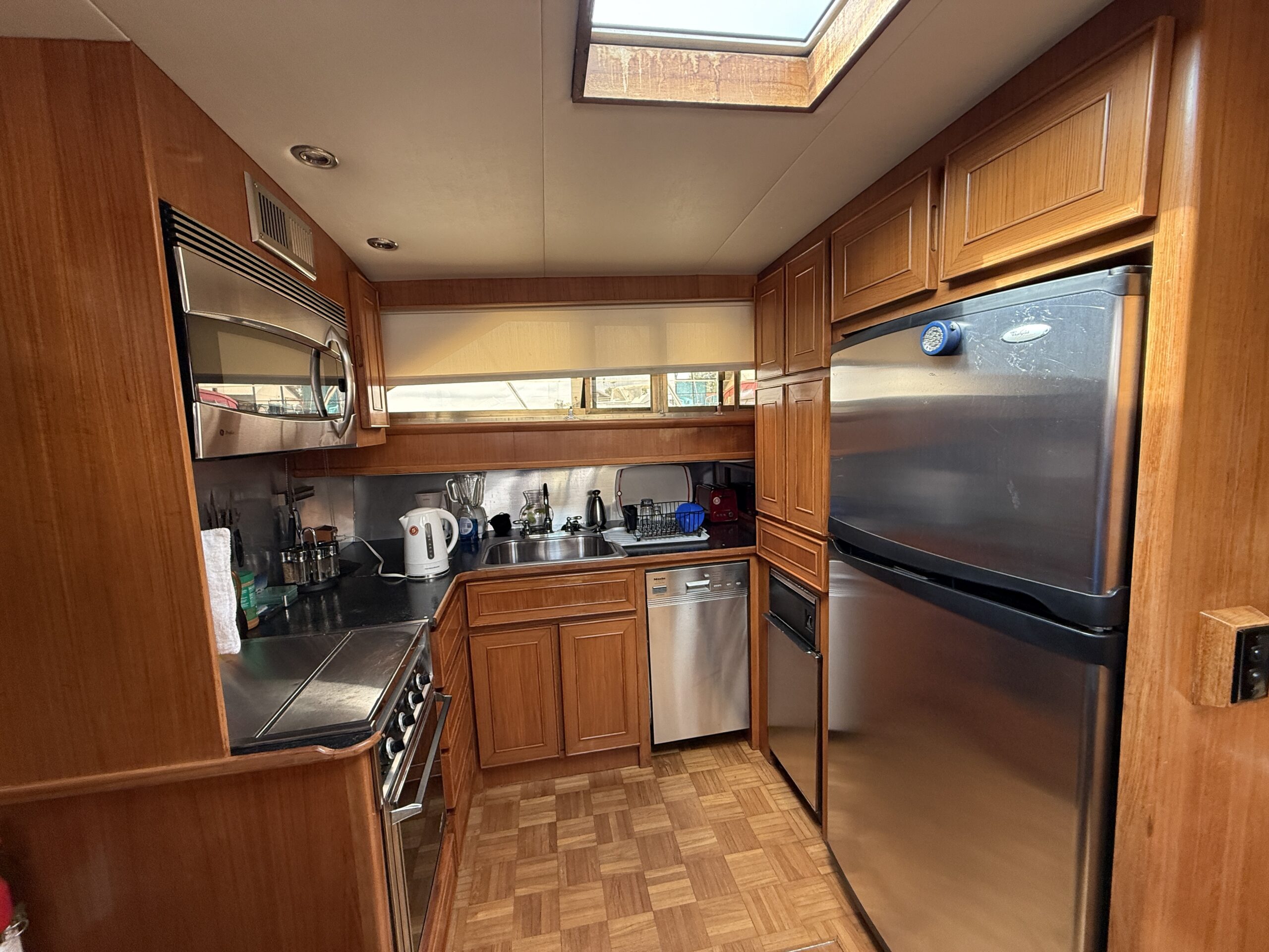 Step into a warm, welcoming salon finished in rich teak joinery with large windows providing panoramic views and natural light. The galley-down design includes full-size appliances, ample counter space, and modern upgrades. The spacious master stateroom is aft, full-beam, and includes a private head with tub/shower. Two guest staterooms forward share a head with a separate shower stall.