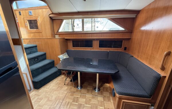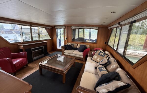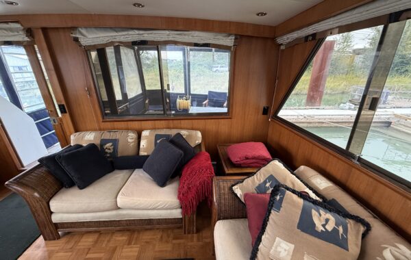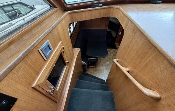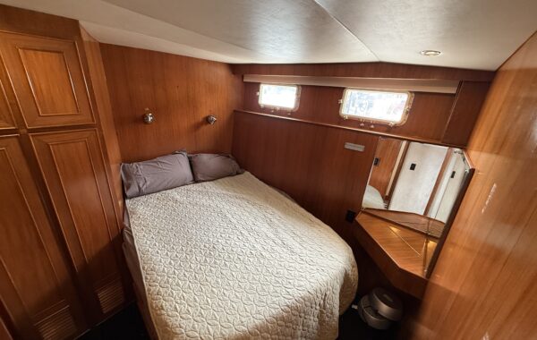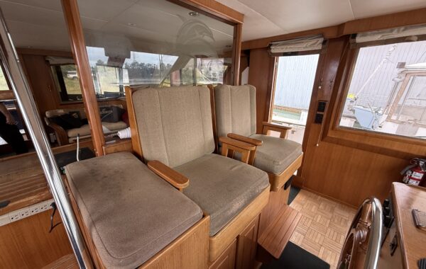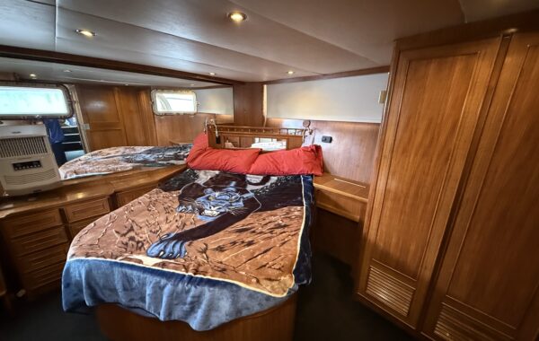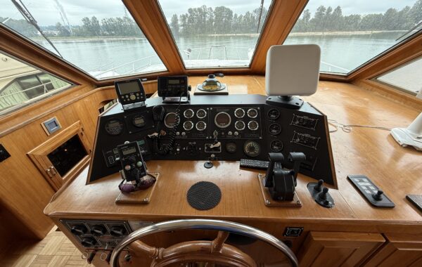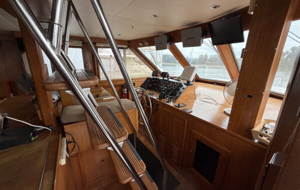 The twin Lugger diesels are commercial-grade, long-life powerplants, offering reliability and efficiency. The boat cruises comfortably at 8–10 knots, with fuel economy suited for long-range voyages. Bow and stern thrusters make her surprisingly nimble around the dock despite her size.