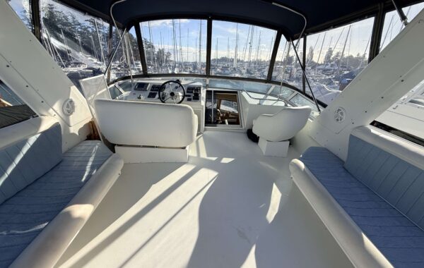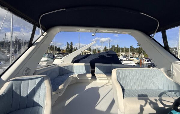 Comfortable Year-Round Cruising – Webasto diesel heat, full flybridge enclosure, and quality construction ideal for Northwest cruising.